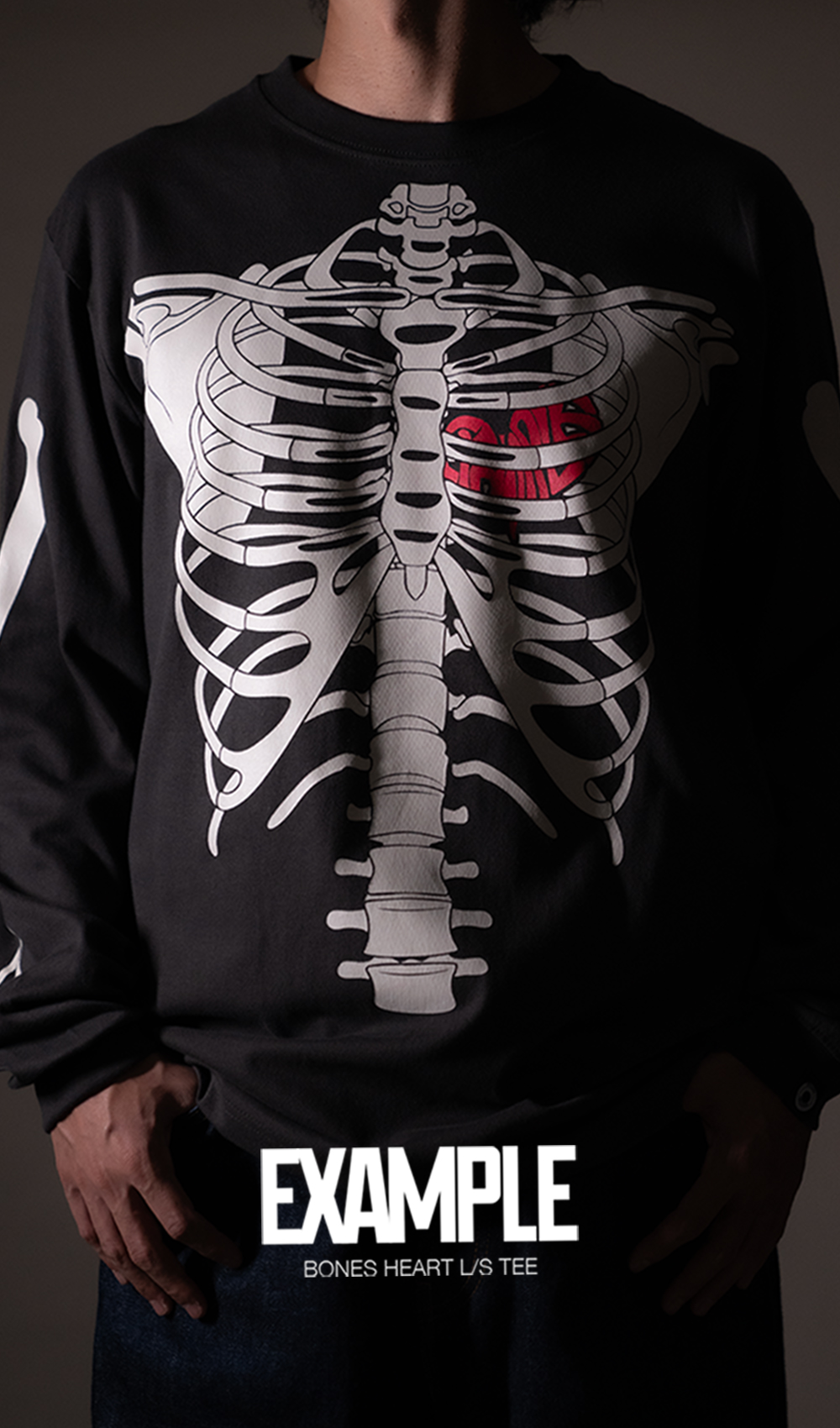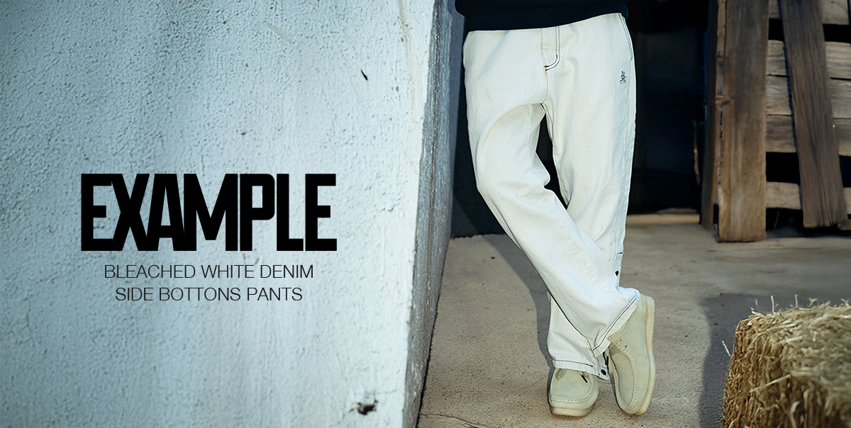 2025.11.2 EXAMPLE / ひとつひとつ手作業で加工を行った「BLEACHED WHITE DENIM SIDE BOTTONS PANTS」、EXAMPLEらしい遊び心を効かせた、骨×ハートのコントラストが印象的な「BONES HEART L/S TEE!」リリース!