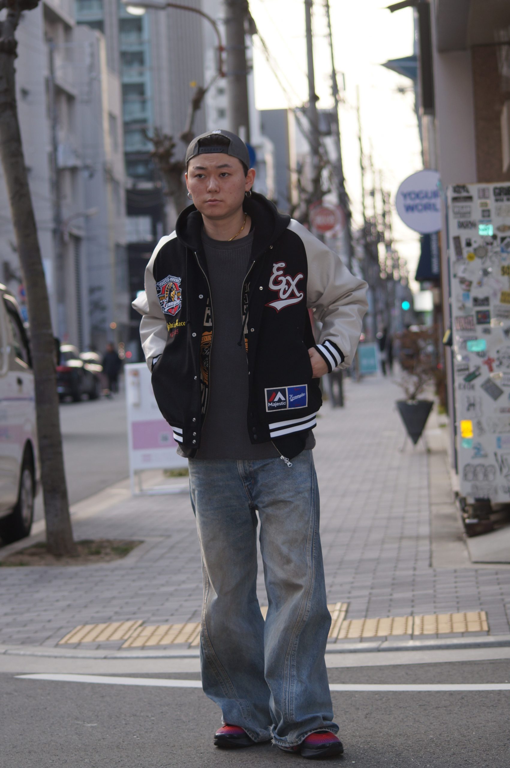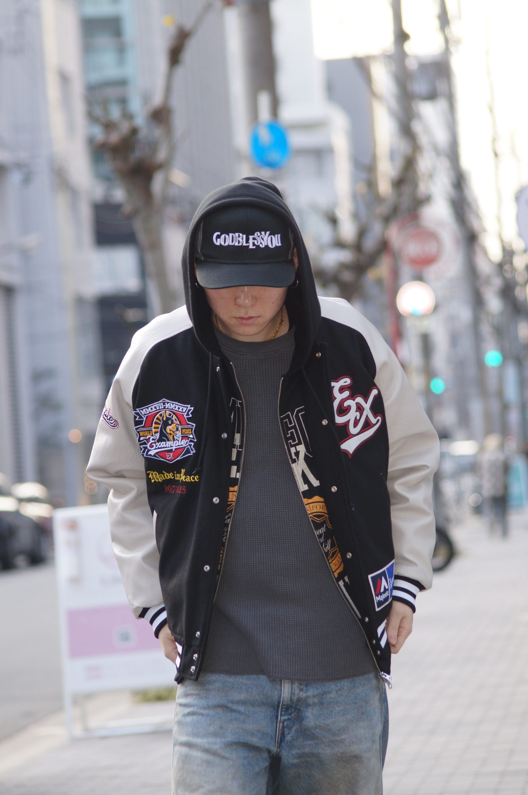 MAJESTICが誇るスポーツウェアの伝統と、EXAMPLEが築き上げてきたストリートカルチャーの精神が融合した特別なコラボレーションジャケット。