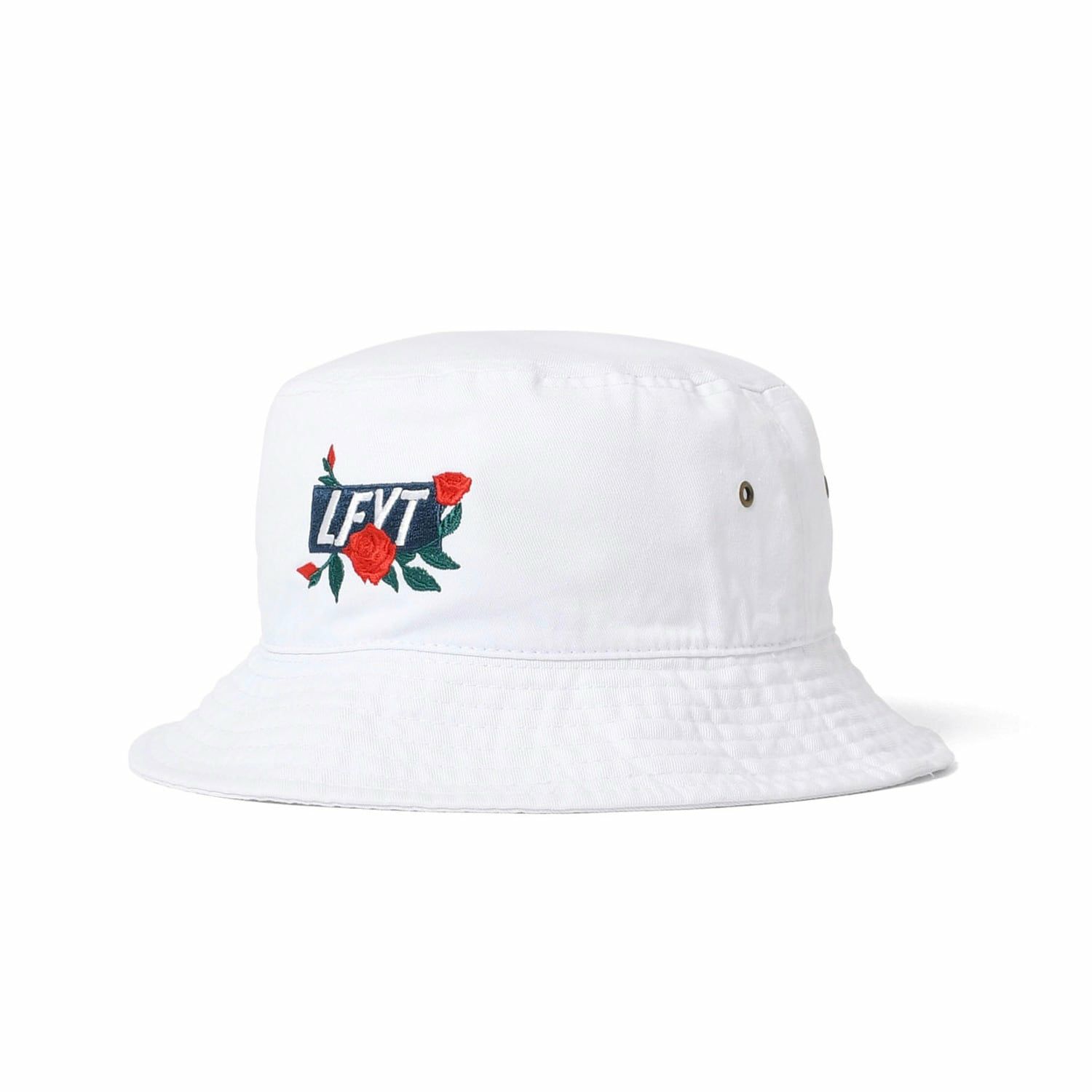 LFYTのボックスロゴにニューヨークの州花である薔薇をあしらったローズボックスロゴを刺繍したコットン素材のバケットハット。