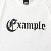 フロントには、オールドイングリッシュで表現された「Example」のロゴを配置。シンプルでありながらインパクトのあるデザインは、コーディネートの主役としても活躍します。