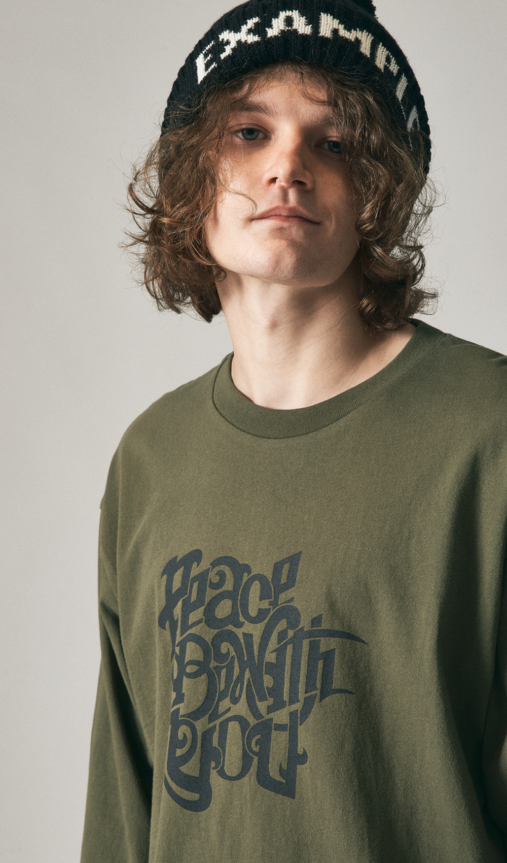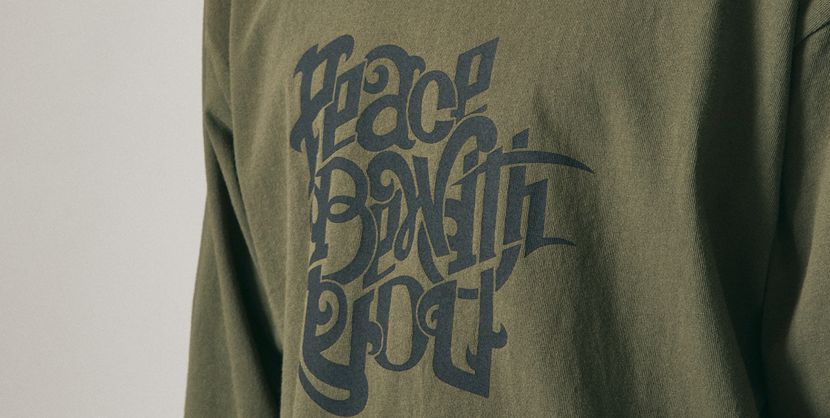 フロントに「PEACE BE WITH YOU」バックには「PEACE OF THE LORD」のメッセージをプリントしたアイテム。