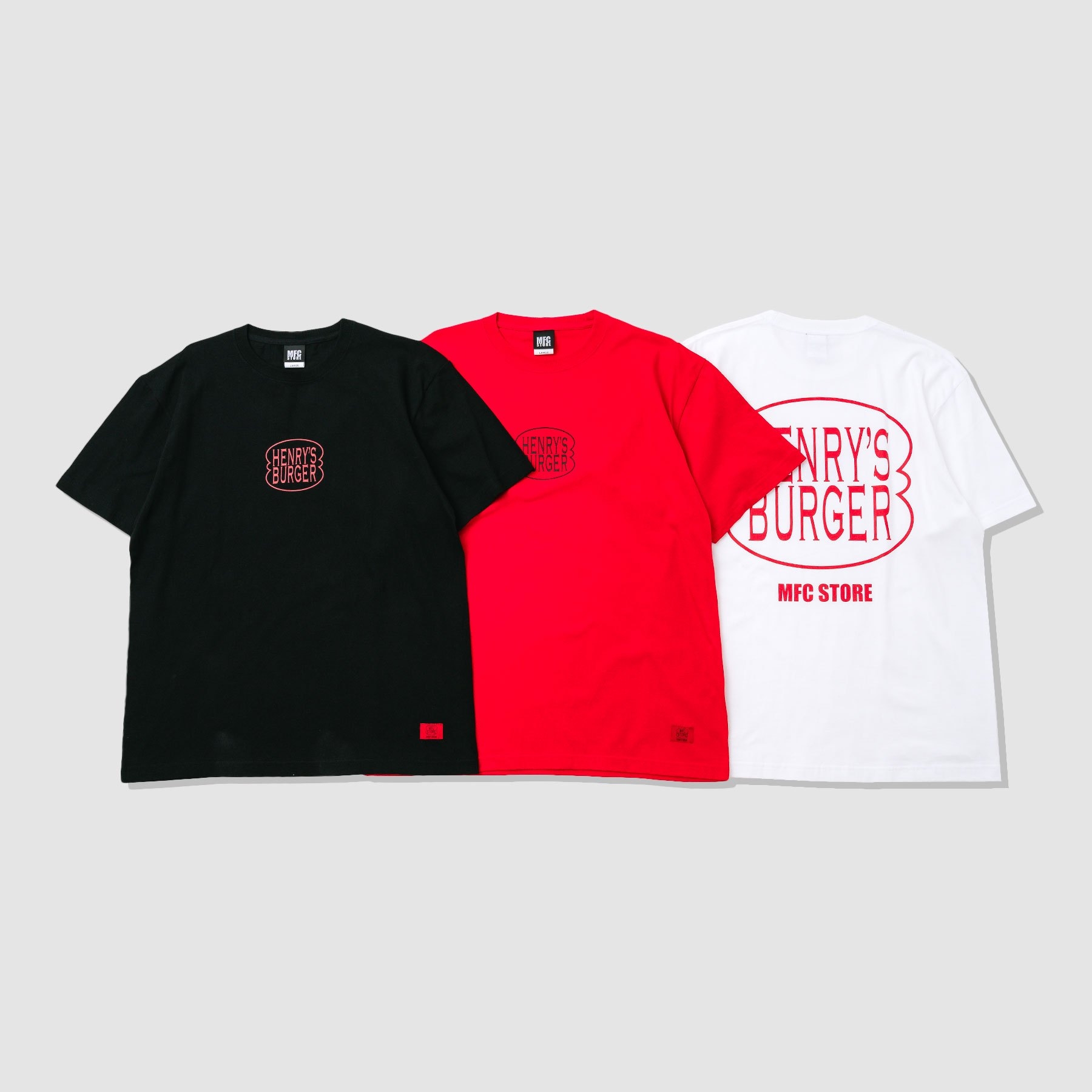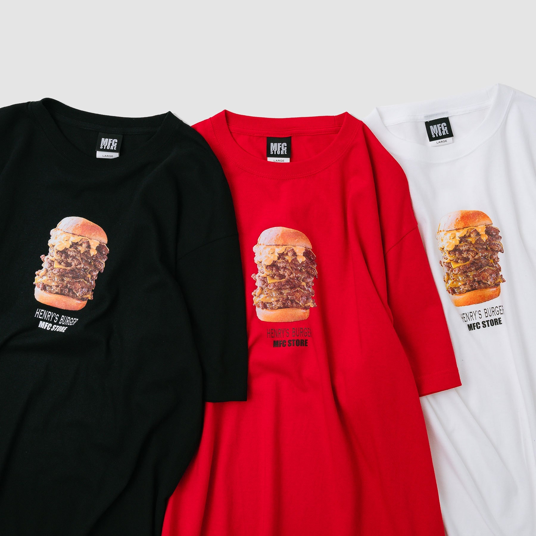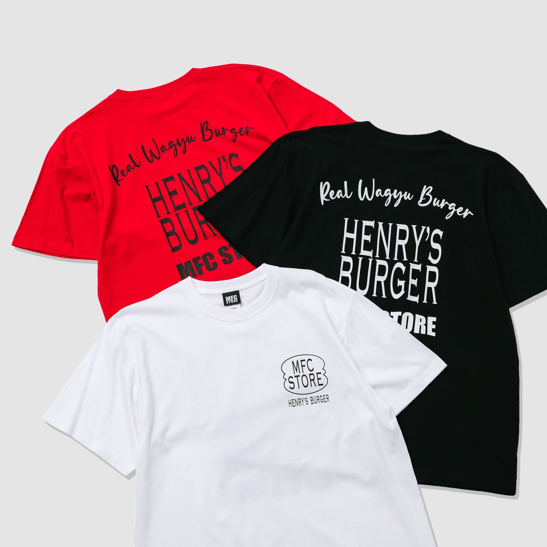 第二弾となる本コラボレーションでは、「MFC STORE × HENRYʼS BURGER」の刺繍ピスネームを施したTシャツ3型を展開!