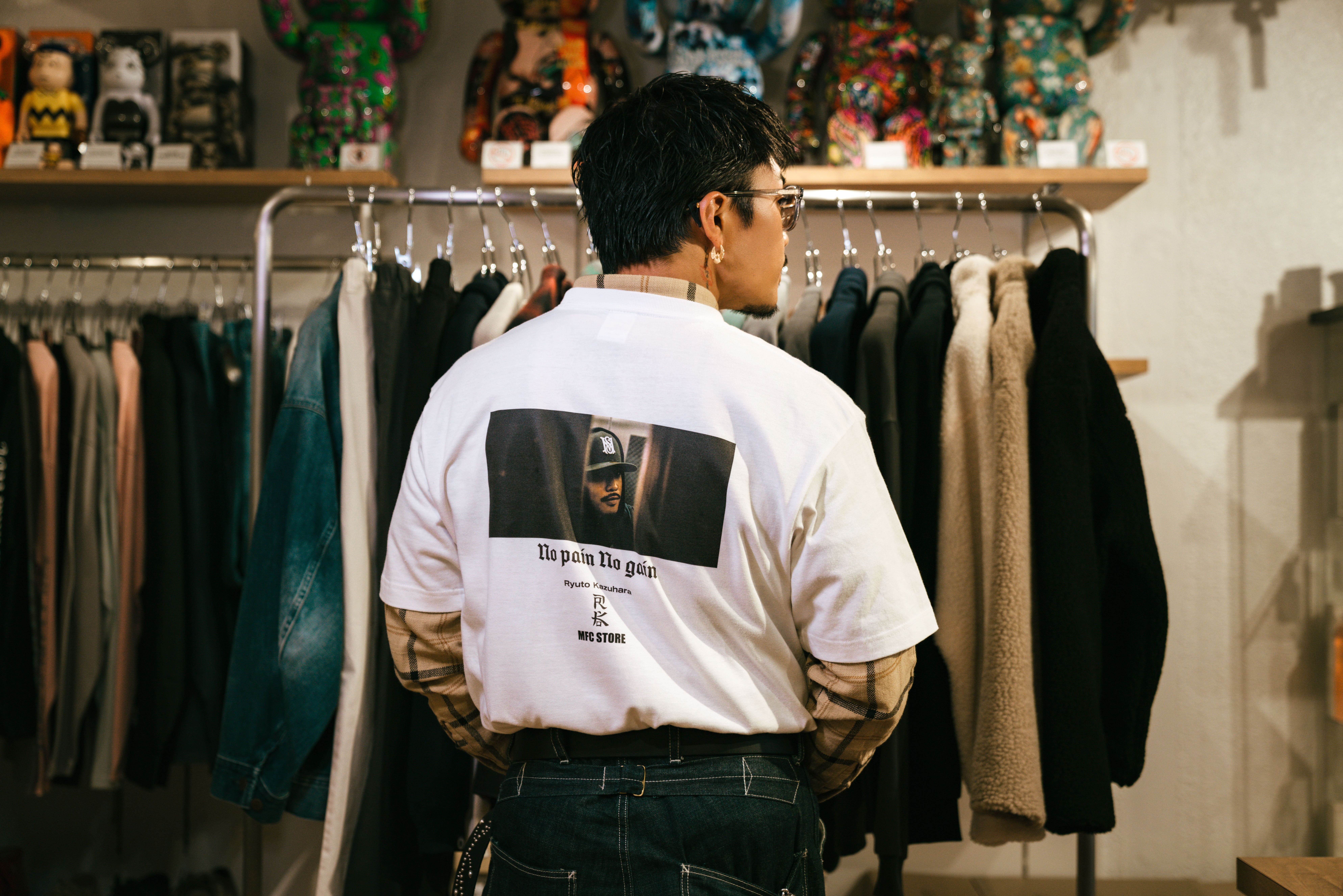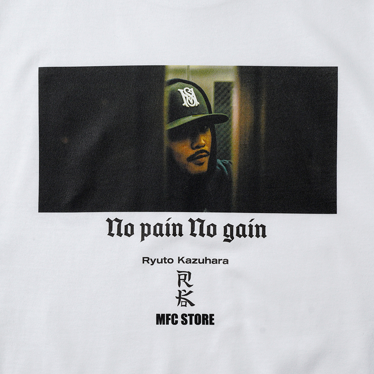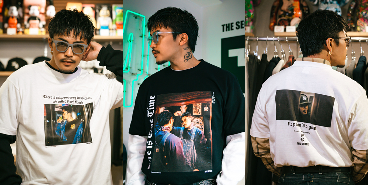 数原 龍友氏をモデルに起用し、RK氏によって撮り下ろされたスペシャルなLOOKと、数原 龍友氏の好きな3つの言葉“There is only one way to success, itʼs called hard work.(成功への道はそれしかない、それは努力と呼ばれるものだ)”、“Life is One Time.(人生は一度きり)”、“No pain No gain.(痛みなくして得るものなし)”のテキストをそれぞれのアイテムに配置。MFC STOREの頭文字から取ったシグネチャーロゴ“MS LOGO” のピスネームに加え、MFC STORE、数原 龍友氏、RK氏の3者のロゴを施したコラボレーションならではのアイテムとなっております。