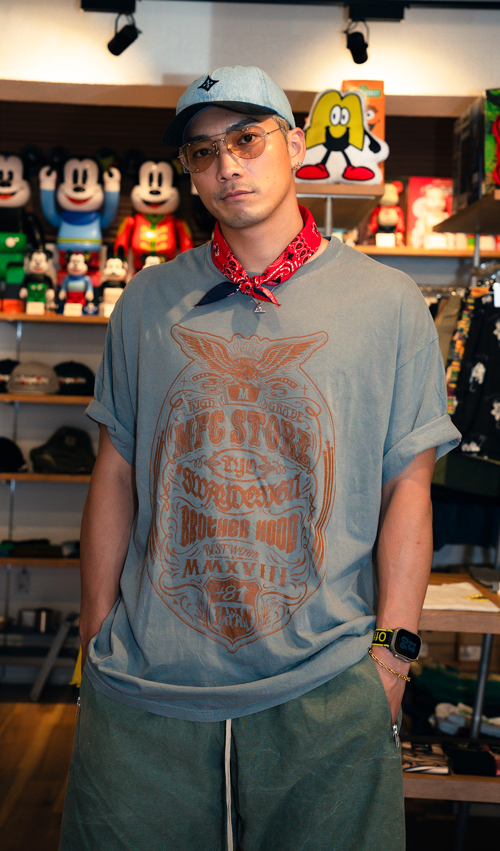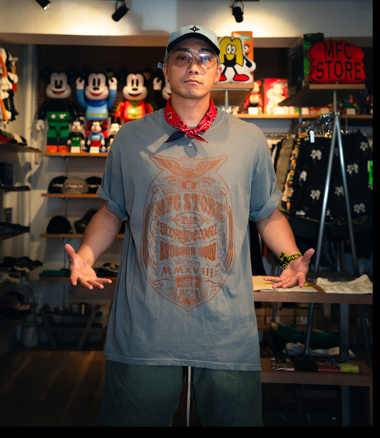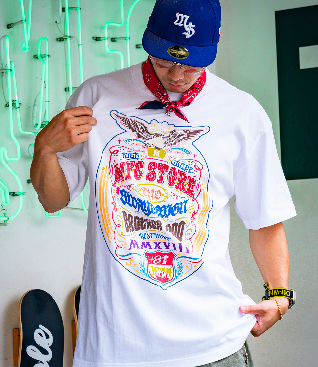 本コラボレーションでは、MFC STORE Producer「近藤 浩人(コンドウ ヒロト)」と親交の深いSWAY氏が、MFC STOREとのコラボレーションの為だけに描き下ろした、スペシャルなグラフィック。MFC STOREで人気が高いピグメント加工のTシャツ6色に、定番の白・黒を加えた全8色の豊富なカラーバリエーションで登場。白・黒は受注販売商品になります。